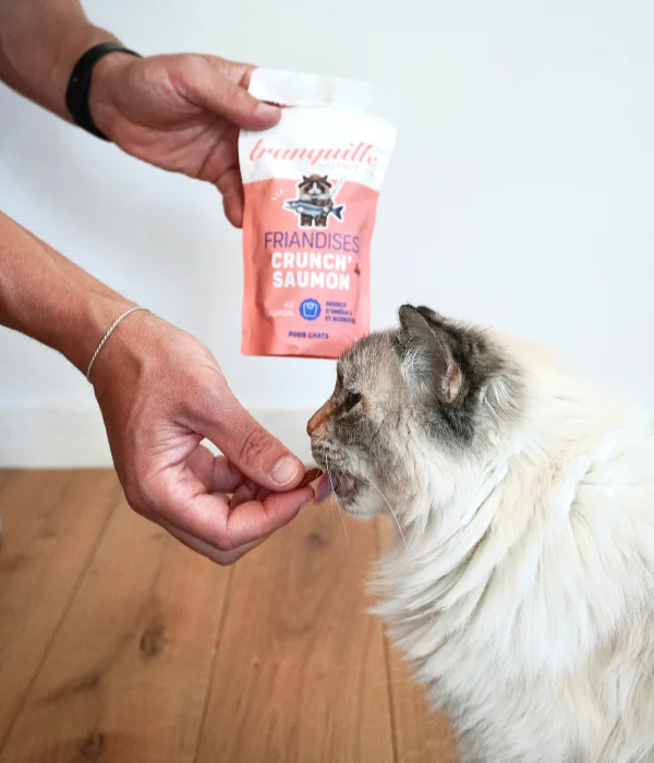 Nos friandises Crunch' Saumon sont naturellement riches en Oméga 3 et en acides gras. Les Oméga 3 permettent de réduire les inflammations, notamment articulaires, tout en soutenant les fonctions cérébrales. Les acides gras nourrissent sa peau, favorisant un pelage brillant et une peau saine. Une recette simple et savoureuse, pour un vrai plaisir gourmand tout en contribuant à l'équilibre de votre compagnon.